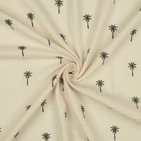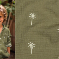 Double Gauze Palm Tree Army Green is a beautiful hydrophilic fabric with subtle mini palm trees. Hydrophilic is a double woven cotton fabric that is not only wonderfully soft and breathable, but also absorbs moisture excellently.
