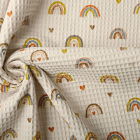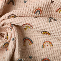 Waffle Rainbow with Hearts Creme is a printed woven fabric. The fabric is breathable, skin-friendly and absorbent, making it suitable for a playpen mat, baby's nest or wrapping cloth.
