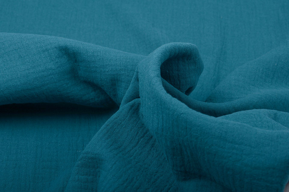Baumwoll Musselin Stoff Petrol Blau ist ein doppelt gewebter Baumwollstoff, der Feuchtigkeit sehr gut aufnimmt. Mit weiteren Eigenschaften wie Atmungsaktivität, geringes Gewicht, Weichheit und Hautfreundlichkeit ist es ein sehr gut geeigneter Stoff für Bettwäsche oder ein Hemd. Die Struktur des Stoffes ist durch den Falteneffekt erkennbar. Man nennt ihn auch Crinkle-Effekt.